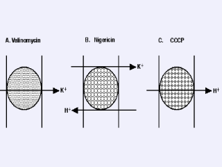 Figure 8. Ionophores. Ionophores are small, lipid soluble molecules that allow specific ions to permeate the membrane. They are classified as (i) mobile carriers [e.g., valinomycin, nigericin, 2,4-dinitrophenol (DNP) or carbonylcyanide-m-chlorophenylhydrazone (CCCP)] that carry 103-104 ions/carrier/sec and (ii) channels (e.g., gramicidin) that move 107 ions/channel/sec which will not be discussed. Many ionophores were discovered due to their antibacterial properties. A dehydrated K+ ion is coordinated precisely and specifically to carbonyl groups in the hydrophilic interior of valinomycin (A) whose exterior is nonpolar and thereby soluble in the membrane. Because valinomycin is neutral, it carries the single (+) charge of the bound K+ through the membrane (i.e., it is electrogenic). Thus, it can be used either to generate DY in response to a K+ gradient or to dissipate DY if flux of another ion (e.g., protons) is generating DY. Nigericin (B) catalyzes the electrically neutral exchange of 1 proton for 1 K+ (preferentially over Na+). Therefore, this ionophore will dissipate DpH specifically. Alternatively, it can be used to convert a K+ gradient into a DpH. DNP or CCCP (C) are lipid soluble weak acids that permeabilize the membrane to protons specifically, thereby collapsing both DY and DpH. |