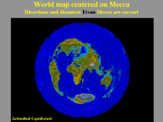 This map has the typical circular appearance of an azimuthal projection. Interestingly it also has the oceans circling the land masses, like some ancients believed. The actual center of mass of the land is near Nancy, France.