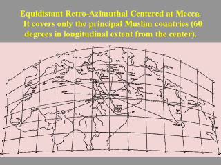 | This map from 1923 shows both directions and distances to Mecca. It covers only the principal Muslim countries (60 degrees in longitudinal extent from the center). Extrapolating out to 90° it converges. Also ponder extrapolating the curved meridians. |