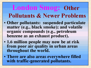 and air pollution epidemiologists. PM10 is a generic term for fine particles that are light enough to be suspended in air for hours to days. These solid and liquid particles commonly have effective diameters < 1 µm, but maybe up to 5 or 10 µm, and hence are typically within the inhalable range. Black smoke, that produced in the incomplete combustion of coal or oil, is one component of PM10. VOC as a group are also important because of their role as precursors, with oxides of nitrogen, in the photochemical formation of summer smog pollution. One VOC component of interest is, primarily for its direct toxic effects, petroleum benzene emitted to air as an exhaust product or through evaporative losses. Data on air pollution levels collected by the Global Environmental Monitoring System indicate that “As many as 1.6 billion people may be at risk from poor air quality in urban areas throughout the world (reported by the Hong Kong Government, Environmental Protection Department, as cited by Elsom, 1996)." Also pointed out by Elsom (1996), a professor of climatology at the Oxford Brookes University, is that congested areas likewise suffer high levels of traffic-generated pollutants, such as carbon monoxide, VOC, and nitrogen dioxide. Professor Elsom has provided an extensive review of the seriousness and causes of air pollution problems encountered by many cities worldwide. |