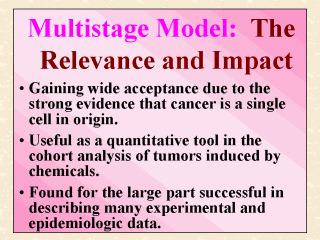 carcinogenic stage. One key substance contained in coal tar is also benzo(a )pyrene. Like the single stage and multicell models described in the last slide, the multistage theory is not completely free of defects. For example, Moolgavkar (1978) has argued that the multistage theory can legitimately be applied only to cohort data for tumors that are not sensitive to environmental influences. Nonetheless, it has been shown that mathematical models based on the general multistage theory are for the large part successful in describing many experimental and epidemiological data (Day and Brown, 1980; Whittemore and Keller, 1978). The multistage theory is gaining wide acceptance in part because there had been strong evidence that cancer is a single cell in origin (Fialkow, 1974; Gartler, 1974). |