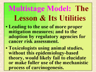 e.g., Federal Register, 1996, 1997). As summarized in the last slide, it was a series of epidemiologic observations that had driven the development of the multistage theory. This series of epidemiologic studies suggested that for many forms of human cancer, the incidence rates R(t) at age t may be written as: R(t) = p(tk), where k is a constant being about 5 or 6 and p is a population-specific proportionality constant. Although the multistage model rests on the single cell theory assuming that only a single cell will give rise to a tumor, initially it had a close relationship with the classic initiation-promotion system of skin tumor in mice. The important lesson here is that toxicologists using animal studies alone without a quantitative theory would likely fail to elucidate or make fuller use of the mechanistic process of carcinogenesis, at least for some forms of human cancer. Again, the multistage model was made possible due to a series of epidemiologic studies that brought out the above power law relationship. |