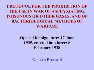 of their respective governments: Whereas the use in war of asphyxiating, poisonous or other gases, and of all analogous liquids, materials or devices, has been justly condemned by the general opinion of the civilised world; and Whereas the prohibition of such use has been declared in Treaties to which the majority of Powers of the world are Parties; and To the end that this prohibition shall be universally accepted as a part of International Law, binding alike the conscience and the practice of nations; Declare: That the High Contracting Parties, so far as they are not already Parties to Treaties prohibiting such use, accept this prohibition, agree to extend this prohibition to the use of bacteriological methods of warfare and agree to be bound as between themselves according to the terms of this declaration. The High Contracting Parties will exert every effort to induce other States to accede to the present Protocol. Such accession will be notified to the Government of the French Republic, and by the latter to all signatories and acceding Powers, and will take effect on the date of the notification by the Government of the French Republic. The present Protocol, of which the English and French texts are both authentic, shall be ratified as soon as possible. It shall bear to-day's date. The ratifications of the present Protocol shall be addressed to the Government of the French Republic, which will at once notify the deposit of such ratification to each of the signatory and acceding Powers. The instruments of ratification of and accession to the present Protocol will remain deposited in the archives of the Government of the French Republic. The present Protocol will come into force for each signatory Power as from the date of deposit of its ratification, and, from that moment, each Power will be bound as regards other Powers which have already deposited their ratifications. In witness whereof the Plenipotentiaries have signed the present Protocol. Done at Geneva in a single copy, the seventeenth day of June, One Thousand Nine Hundred and Twenty-Five. |
