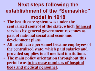 | By 1941, when Russia entered the Second World War, the health care system was well developed and had succeeded in bringing reliable health care services to the entire population. |