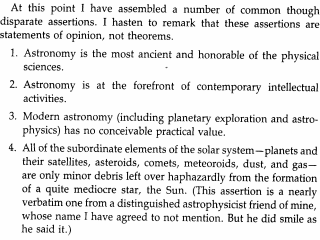 difference in everyday life. 6. Astronomy is merely one of many applied branches of the basic physics. 7. The only defensible purpose of publicly supported science is its potential for utilitarian applications. |