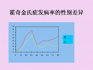 性别比告诉我们关于霍奇金氏症的更多信息。图表上在早期有一个峰值,代表女性发病较多,之后有一个降坡,同时性别比接近1,然后又有一个平缓的升坡。这个图表适用于3种不同的疾病,也包括霍奇金氏症,因为这些疾病发病率都在年龄有很大差异,同时也可能与性激素的分泌有关