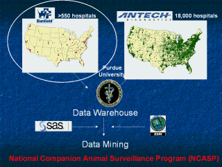 pets yearly · The main sources of data input are the >560 Banfield veterinary hospitals and the 18,000 private veterinary practices that use laboratory services provided by Antech Diagnostics · The data from Banfield hospitals is updated and downloaded daily by Purdue University while that from Antech is obtained on an ad hoc basis · The primary analytical tools used in data mining at Purdue are SAS and ESRI for GIS · NCASP is maintained by Purdue University and Banfield the Pet Hospital and the information is shared with public health agencies and industry partners on a need to know basis. Currently there is no formal reporting mechanism when an signal is generated by NCASP. |