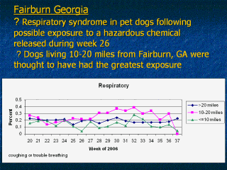 · This graph shows that the frequency of respiratory signs increased for dogs living 10-20 miles from Fairburn, GA following the chemical release during week 26, compared with the previous weeks.