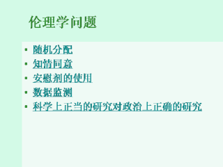 为病人随机分配治疗是否符合伦理呢?当一项前途光明的治疗方法已经可以获得但其效力仍未知时不进行随机分配是否符合伦理呢?真正意义上的知情同意是否从来被获得过呢?什么时候使用安慰剂才是适当的?治疗的效果(益处和/或副作用)是否应在试验过程中被检测,中期结果应如何使用?