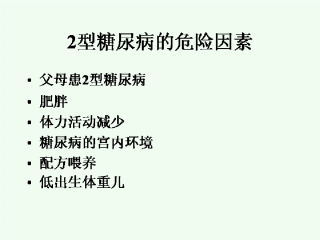 这张幻灯片总结了2型糖尿病的许多重要危险因素。这些因素及相互作用的理论对制定2型糖尿病的预防措施是非常必要的。