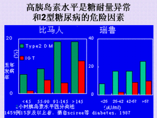 也显示了同样的结果。这里的居民同样具有很高的糖尿病发病率。空腹胰岛素水平高者更容易得糖尿病及糖耐量异常。所以,空腹或负荷后胰岛素水平过高将导致糖耐量异常及