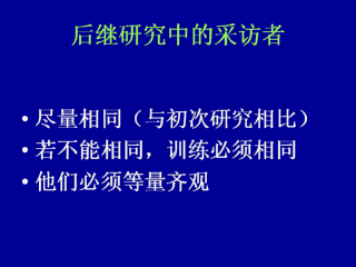 任何后继研究中的问题之一即是采访者。如果后继研究延长,采访者可能不同,即使相同他们也可能更高效或者仅仅会在提问的方式上有所不同。所以,同样问卷的两次应用可能不具可比性。