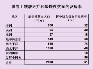 美国关于铁缺乏症和贫血的可行性信息表明,有940万人患有铁缺乏症或贫血。用贫血作为缺铁性贫血的指针,通过世界卫生组织收集的多个国家的数据,De Maeye估计在发展中国家50%的儿童和妇女以及25%的男性铁缺乏,在发达国家7%~10%人口铁缺乏。