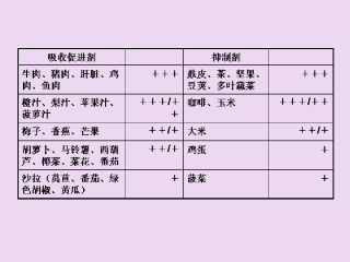 另一方面,非血红素铁的吸收受膳食中其它成分的影响,或抑制或增强,见表所示。