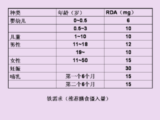不同的生态环境间铁的推荐膳食供给量(RDA)变化很大,从出生6个月时的每天6mg到妊娠期的每天30mg不等。正如前面所述,妊娠期、哺乳期和分娩期的女性对铁的需求较高。