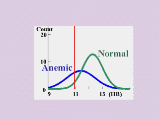 如果使用红线所示的截止点,那么正常人体的变化部分将被认为是贫血(假阳性)。另一方面,贫血者的变化部分则会被人为是正常(假阴性)。