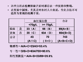 分析了与血红蛋白值比较临床贫血的敏感性、专一性和阳性预测值,见表所示:此时,即便是通过临床检查诊断为贫血的人群中有25.8%的人是真正贫血(阳性预测值),那么在发病率较高的地区治疗假阳性对他们来说也是有益的。这是基于假设贫血人群代表着病情最严重者,但是治疗假阳性者也对哪些认为可能存在铁缺乏的人有益。
