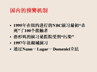 1995年纽约进行的NBC演习表明最初的100名急性反应者死亡,是-由于他们没有做好足够的准备或受过应对这种情况的训练。在洛杉叽,一个类似的演习显示医生对病人的处理会导致受害者污染医院。类似的结果也出现在1997年盐湖城的演习中。