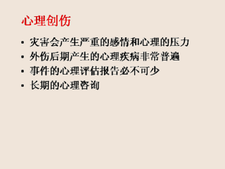 灾害会对受害者和救援人员的情感和心理产生严重的影响。外伤后期的心理疾病对受害者的身体机能存在潜在的影响,这种影响可长达数年。灾害应急机制应该包括突发事件中的心理压力评估计划以及对受影响人群提供其它心理咨询服务。这些服务应该在处理灾害事件中尽早进行。这将帮助那些医疗救援人员发泄他们的情绪,并且可以鉴别处那些可能需要进一步心理咨询的人员。