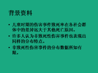 儿童时期的损伤事件发生率在不同社会群体中的差异远大于其他致死原因。贫困地区儿童相当一致地具有更高的死亡率,这一现象是由多方面的原因所致。贫困与伤害事件死亡率之间的关联在各国差异很大。相对于其他国家而言,某些国家贫困地区与富裕地区儿童死于损伤事件的差别要小一些。例如,在英国这一差别很大,而瑞典的差异就小一些。