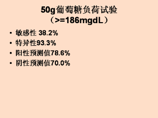 提高到 > 186 mg/dl,替代口服糖耐量试验。用以口服糖耐量试验为金标准,他们发现试验的阳性预期值78.6%,这意味着将近79%在糖负荷试验中阳性的女性不需要进一步的检查就可以正确地诊断为妊娠糖尿病。 Landy登人研究人群的妊娠糖尿病的患病率是39.2%。