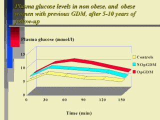Damm 等人(1995)的研究中,妊娠糖尿病妇女产后至少随访5年,再次监测葡萄糖负荷后的血糖水平。以前有过妊娠糖尿病的妇女中,肥胖妇女的血糖水平比非肥胖妇女高。对照组妇女的血糖水平在实验中一直最低。