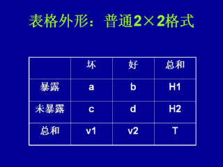 这是一个包含两个变量的表格的示例。疾病状态(生病、健康)通常注于表格抬头(x轴)。暴露状态(暴露、未暴露)位于侧边(y轴)。