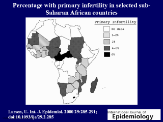 of global health, since as I have shown, M. genitalium has been found to be extremely prevalent among certain African populations. Also, given the high prevalence of HIV in Africa and the frequent co-infection of HIV and M. genitalium, an M. genitalium epidemic might arguably coincide with the HIV epidemic in this region. In the context of global infertility then, one might wonder if infertility rates seem to be higher in parts of Africa and other developing countries. Although you can see in this map that the prevalence of primary infertility is relatively low throughout sub-Saharan Africa, likely due to the fact that women in Africa have their first child at a very young age, |
