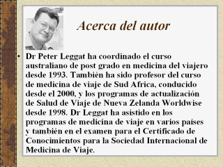 Africa. Sus calificaciones incluyen: MD (alto doctorado en Medicina), Universidad de Queensland, Australia PhD (en Salud Ocupacional), Universidad del Sur de Australia DrPH (en Medicina de Viaje), Universidad James Cook, Australia Dr Leggat es un especialista en medicina salud pública y mantiene membresías en varias organizaciones profesionales. Es antiguo Escolar Fulbright y recibió la Medalla del Cirujano General (Australia) en 2002. Ha sido mimebro de la Oficina de Miembros de la Sociedad Internacional de Medicina de Viaje (2003-2005), la Organización Mundial de Seguridad (1989-1999, 2003-2005; incluyendo Director General 1997-1999), y el Colehio Autraliano de Medicina Tropical (1991- a la actualidad; incluyenbdo presidente 1996- 1998, 2002-2004; presidente electo 2005-al presente). |