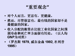然而当最近像罗杰斯和理查德·威尔金斯这样的人开始关注财富的量化标准,如人均GNP,和死亡率之间的关系时,他们发现,人均GNP越高死亡率越低的关系只适用于总体人均GNP水平较低的情况。当人均GNP在5000美元以上时,这个关系就消失了。发达国家中最发达的比如美国和德国,他们的人口预期寿命就不如那些虽然穷但是贫富差距小的国家如冰岛和希腊。