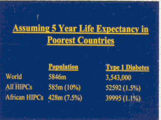 | Let’s estimate how many patients with Type 1 diabetes will be if instead of life expectancy of 1 year in the world poorest HIPCs those the adult life expectancy as a whole as less than 50 years of age. If the life expectancy will be 5 years instead of 1, the total number of Type 1 patients would increase at any one time to around 53000. |