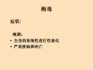 在未经治疗的患者中,有三分之一将进入梅毒晚期或者第三期。晚期症状包括肌肉协调性丧失,瘫痪,疼痛感丧失,痴呆或者其它个体化的病变,如阳痿,精痛,肿瘤或者多器官病变,并损伤关节,足面或足底的溃疡等等。患者可能死亡。