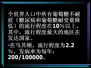由于IGT预示着以后得糖尿病以及其他相关疾病,例如心血管疾病的一个高风险,因此糖尿病和IGT的联合流行程度是在一个给定的人口中对于公共卫生效果的有效估量。