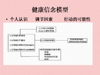 健康信念模型是在上世纪五十年代提出的,起初用来解释为什么越来越多的人不接受联邦政府提出的免疫计划。(Rosenstock,1900) 这个模型经受住了时间的考验,现在经常被用来规划健康促进计划和解释人们能否养成新的健康习惯的原因。这个模型特别关注在真正的医疗照料不能保证的情况下,人们养成新的健康行为。注意到这个模型的核心构架是基于感知的,也许倒回几张幻灯片,看看关于信念和感知的作用的讨论会对你有所帮助。那些类型的信念已被证明,在人们是否会采取预防措施中起着十分重要的作用。接下来的幻灯片里,我们要更详尽地讲一讲每一类信仰的作用。