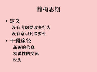 这一阶段的人根本就没有想过要改变习惯或者不健康的生活方式。约有40%的人是处在前构思期的,这有助于解释为什么健康促进计划可能达不到预先设定的健康成果。这一阶段的人很可能多次尝试过改变行为而失败了,所以他们常常自责并且失去了信心。这些人看到的更多是行为改变带来的负面的而不是正面的作用,因此没有准备好要行动。