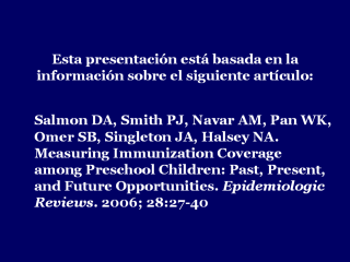 | Esta presentación se enfoca primeramente en la medición de la cobertura de las inmunizaciones en Estados Unidos. Sin embargo, la mayoría del contenido será de utilidad para otros en países en desarrollo o desarrollados. |