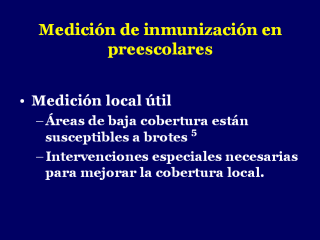 Es muy importante medir la cobertura de inmunización localmente y no sólo en grandes unidades como estados o naciones. Esto, debido a que la cobertura de inmunizaciones no es usualmente homogénea dentro de estados o localidades. Áreas de baja cobertura deja a la población susceptible a brotes de enfermedad, tal como ocurrió en los EUA entre 1989-91 con el re-surgimiento del sarampión. Mientras que la cobertura para vacuna MMR fue considerablemente alta a nivel estatal y nacional, hay muchas áreas de baja cobertura tal como regiones en Los Angeles y detroit. El resultado de esas áreas de baja cobertura fue un mayor re-surgimiento de la enfermedad. La cobertura de inmunización es un importante tema local. Además, la medición de la cobertura al nivel local, permite intervenciones a ser enfocadas a áreas localizadas para mejorar la cobertura de inmunización.