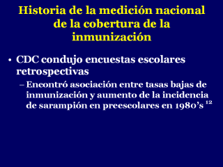 | CDC no reunió datos sistemáticamente de la cobertura preescolar nacional de 1986-1991. En 1990, CDC condujo encuestas escolares retrospectivas de 1º y 5º grados en 8 áreas urbanas para evaluar el status de inmunización de sarampión. De 1990-1994 CDC recomendó que todos los estados condujeran encuestas escolares retrospectivas. |