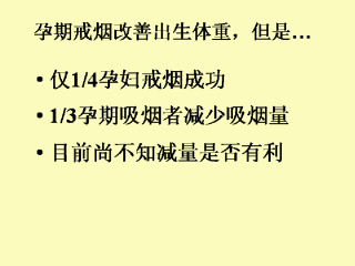 出生体重常被用作孕期吸烟研究中的一个结果。至今大多数已发表的研究报道了一个200-300g的出生体重平均减少值。吸烟可能是造成占高达30%低出生体重病案的原因。即使有风险,大多数妇女还是不能在孕期停止吸烟。仅1/4戒烟成功。然而,1/3减少了吸烟量。减少吸烟量(但未戒断)对于出生体重的影响尚未明了。