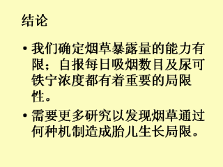 我们当前并没有一个用来反映烟草暴露量的可靠的身体表征。自报每日吸烟数目及尿可铁宁浓度都有着重要的局限性。确定一个更好的反映烟草暴露量的身体表征的努力需要加强。