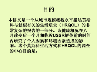 1.) 从城市水平上建立一个基本卫生轮廓,这里面有卫生的不公正,有危险因素的纵向比较,以及城市里面发病模式的不同;