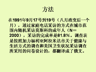 莫斯科州立大学负责样本设计、调查方法翻译和数据收集。在莫斯科市电话局的赞助下,我们进行了电话采访。对莫斯科卫生概况的衡量包括