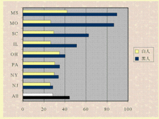 以白人男性的数据为序排列。在部分州,黑人和白人的冠心病死亡率(ICD 410-414,429.2)相同。例如:新泽西,纽约,宾西法尼亚和俄亥俄。在密西西比,密苏里,南卡洛尼亚和伊利诺斯,冠心病死亡率(ICD 410-414,429.2)在35-44岁男性中黑人男性比白人男性高2倍。