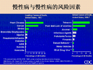 本片十分清晰地呈现出生活习惯因素与慢性病导致的死亡之间的联系。左图显示的是美国1990年导致死亡的10大因素。这些因素在很长一段时间内都保持不变。亮绿色条带显示了已知与生活习惯相关联的因素。右图显示了一些特殊的生活习惯类型,由此图你可以对1990年这些生活习惯在美国导致了多少例死亡进行估计。值得注意的是那些更多为大众所关心的行为例如违禁药品的使用和性行为,与吸烟、饮食和锻炼等方面相比尚处于较低的水平。显然,没有比这更明了的方式来说明培养健康的生活方式对提高生活质量的重要性了。
