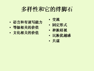 这张幻灯片是总论:接下去的部分会展开讲述各个影响多样性的绊脚石.