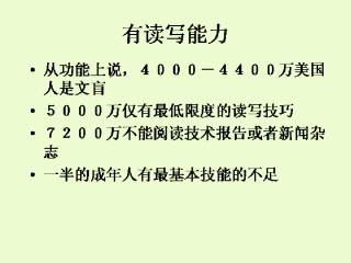 据估计,21%-23%的成年人,或者4000-4400万美国人是功能上的文盲.他们不能在日常生活的情况下使用阅读,说话,书写和计算的技术.当阅读能力在第四等级水平时,他们不能填写求职申请表,按指导书写或者读报纸.另外的25%-28%成年人,约5000万人,只有最低限度的读写技巧,意味着他们不能理解,解释和应用书面资料来完成日常的任务.他们的阅读水平在第八等级水平,但是,比如说,还不能领会一份报纸或者杂志的内涵.大部分低读写能力的成年人是本土生的白人,但是年长的,非白人,国外来的移民和贫穷的都不成比例地能力低下.(全国成年人读写能力调查,美国教育部,1993)