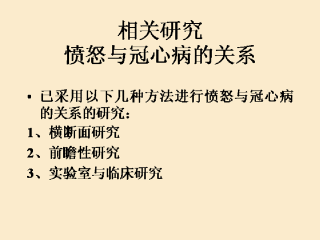 不同的心血管疾病的结局以及各种研究方法都提供了有效证据证明愤怒与冠心病的关系。不可否认,最据说服力的就是studies that