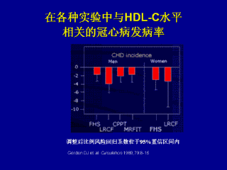 Trial (CPPT)和Multiple Risk Factor Intervention Trial(MRFIT),分析了HDL-C和冠心病发病率(与年龄,血压,吸烟,体重指标及低密度脂蛋白类胆固醇有关)之间的关系。HDL-C水平降低1mg/dL可以显著引起男性患冠心病的危险降低2%(FHS,CPPT和MRFIT)女性降低3%(FHS)。在这张幻灯片中LRCF的回归系数主要是由关心病的死亡率引起因为那项研究只列举了最关键的结果。