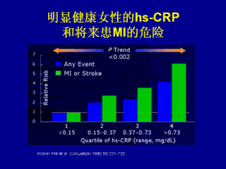 一个重要的临床上的考虑就是这些数据的可概括性,尤其是对女性。在女性健康研究中,前瞻性队列是由38,000名中年,主要是绝经期后美国妇女组成,他们在研究以前都没有心血管疾病,随着C反应性蛋白水平从中低变为中高,这个队列中未来发生血管性事件的相对危险性也相应地升高。对于所有的血管事件和特异性的MI或中风的联合终点都是这样。