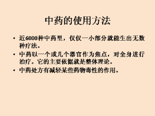 在绝大多数情况下,中药是在针对一个或多个人体器官(譬如心脏,脾脏,肾脏,肺,血液等等)的基础上对人的整个身体进行治疗的,它的基础主要是整体概念。中药也被用于治疗癌和过敏。中药都不甜,那些比较主要的中药一般都散发出很不好闻的气味,味道也非常的苦。这确实是中药另人讨厌的一方面,特别是对于那些身体极度虚弱、已经不能再承受任何痛苦的病人来说。